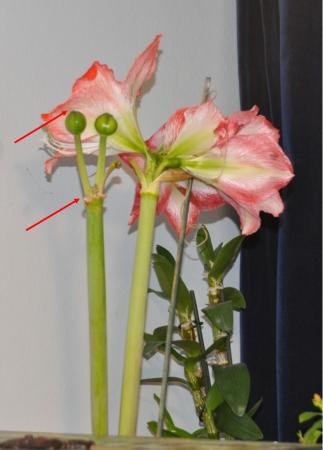Nogmaals een vraag over de Amaryllis. De verdorde bloemen, van de eerste bloemstengel (links) zijn afgeknipt direct na de verdikking (bovenste pijl). Aan de twee nog overblijvende kleine bloemstengels (als dat zo genoemd mag worden) komen nu kleine bolletjes. Zijn dit zaadbolletjes? En, is de verdorde bloem op de juiste manier verwijderd, of had dat beter lager gekund (onderste pijl)?