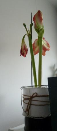 In huis staan 4 amarylissen. Drie van vorig jaar, en een nieuwe. De laatste (amorice?) stond eerst iets te dicht bij het raam, welke soms even open is, waardoor de tweede bloemstengel iets verkleurde. De pot is verzet, (bijna) niet meer in de tocht, bij de tweede bloemstengel zijn nu enkele bloemen open gegaan. Foto is bijgevoegd. Wel erg zwak. De bloemen worden nu d.m.v. een stokje en touwtjes rechtop gehouden (staat nog niet op de foto). Enkele vragen nu: a Waarom mogen bollen binnen niet volledig in de grond? De bol stak eerst ca. 1/3 boven de grond uit, met daar op een laagje houtsnippers. Hiervoor in de plaats is weer grond aangebracht, maar volgens berichten op internet was de oorspronkelijke situatie beter. Verschil met buiten is licht en temperatuur ´s nachts (in de winter ook overdag). b Een gewone binnenpot, met gaten onderin, waarop evt. enkele brokken van stenen binnenpotten, is mogelijk beter dan de glazen pot. Dit ook n.a.v. berichten op internet. I.v.m. doorlatendheid. Of, mag de bol wel in de dichte pot blijven? c Bij deze Amaryllis groeiden eerste de bloemstengels. Er zijn op dit moment kleine puntjes van de bladstengels te zien. Bij de bollen van voorgaand jaar, welke een rustperiode gehad hebben, groeien op dit moment alleen de bladstengels. Vraag is of de bloemstengels nog wel tot ontwikkeling komen (indien aanwezig). Zoniet, kunnen deze bollen dan een volgend jaar, bij goede overwintering (was nu niet helemaal volgens de instructies) nog weer tot bloei komen? Op deze site (https://tinyurl.com/y63xnk8l) staat heel veel informatie over amaryllissen, met de vermelding dat het soms lukte ze bijna 20 jaar lang weer in bloei te krijgen.