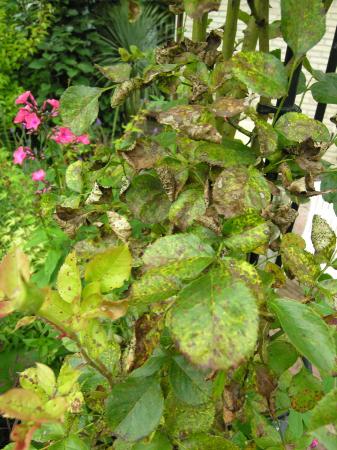 Een van de 3 klimrozen hier krijgt elk jaar na de eerste bloeiperiode gele en vervolgens bruine vlekken in de bladeren, die tenslotte verdrogen en afvallen. Alle rozen zijn nu vrijwel uitgebloeid en ik heb de bloemtakken flink teruggesnoeid. De aangetaste plant herstelt zich waarschijnlijk wel gelet op de ervaring van vorig jaar en de nieuwgroei ziet er dan weer goed uit.