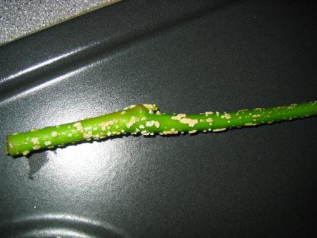 Die witte puntjes zijn beginnende wortels. Zet de stek in (kleddernatte) aarde en hou hem daarna vochtig maar niet meer zeer nat. Van de winter koel en aan de droge kant overwinteren.