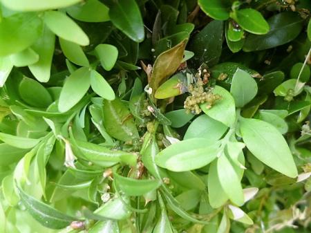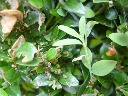 Je ziet wel dat er een paar hapjes uit bladeren zijn genomen en de uitwerpselen zijn ook van rupsen van de buxusmot.... toch maar wat aan doen als je niet veel meer schade wil hebben.