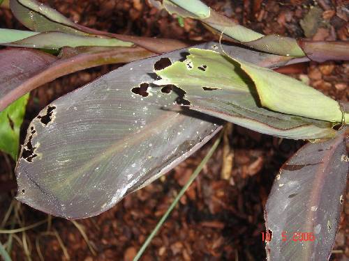 Canna vertoont beschadigde bladen met gaatjes