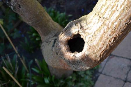 elata (duivelswandelstok) in mijn tuin. In het midden van de stam zit een gat waarin na iedere regenbui water blijft staan en zich een laag modder vormt (zie foto). Ik ben bang dat hierdoor de stam uiteindelijk helemaal weg rot. Kan ik hier iets aan doen, bijvoorbeeld door het gat ergens mee te vullen?
