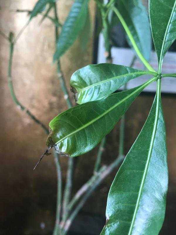 Geen zorgen. Deze Pachira heeft vaker last van bladvergroeingen. Oorzaak is waarschijnlijk de tochtige standplaats in het verleden. De beschadiging ontstond in het groeipunt, waarbij na uitgroei de schade pas zichtbaar werd. De jonge bladeren zullen er geen last meer van hebben..