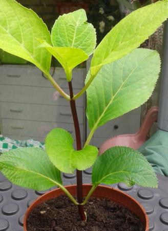 Dit is een stek van een hortensia. Hoe nu verder? Moet ik de kop eruithalen of eerst groter laten worden
