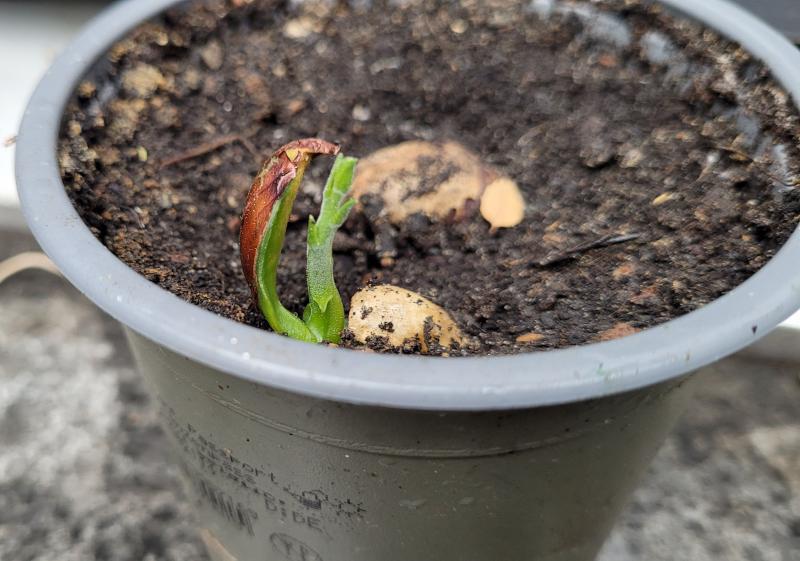 Mijn man heeft in januari een jackfruit uit Indonesie meegenomen. Na het eten van de vrucht heb ik de pit in een potje op de aarde geplaatst om te zien of het ging ontkiemen. En ja hoor, heb wel lang op moeten wachten (5 maanden!) maar een paar weken geleden kwam een klein plantje uit. het plantje groeit wel snel en nu, na zo'n 2 weken, is het al een mooie kleine plantje.