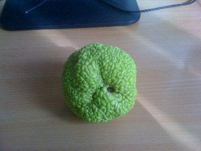 Dit lijkt erg op een vrucht van Maclura pomifera, Nederlandse naam is Osagedoorn (heeft inderdaad erg gemene stekels).