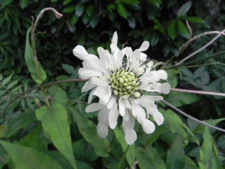 Dit lijkt me geen klimplant, maar Scabiosainfo-icon caucasica 'Alba', schurftkruid. Mogelijk staat de plant aan de voet van een klimplant.