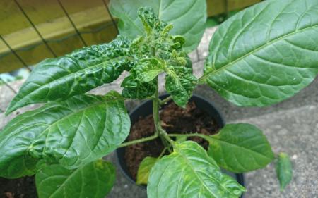 Ik heb een aantal peperplanten op de vensterbank staan en sinds kort vertonen ze onregelmatigheden. Blad krult op / verschrompelt / ziet er aangedaan uit. Ook ligt er plakkerig spul op de vensterbank met witte spikkels. En er lopen groene beestjes over de plant.