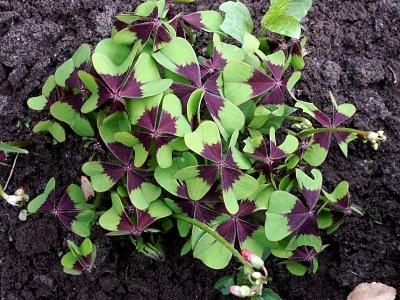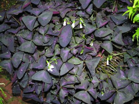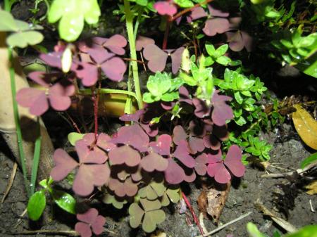 deppei heeft inderdaad vier deelblaadjes, maar het taaie 'onkruid' corniculata tevens commensaal bij mijn kuipplanten heeft er 3 evenals enkele andere aanwezige soorten, een groenbladige met rose bloemen en Oxalis regnellii atropurpurea (foto), een sterke soort die het ook goed doet op een beschutte plaats in de tuin. Deze variant met donkere bladrand wordt tegenwoordig minder aangeboden dan de effen paarse of groenbladige selectie.