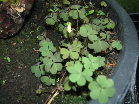 al een tijdje komt er thuis overal tussen de planten, tussen de schors en tussen de kiezels een plantje uit. fotocamera is kapot dus zal het beschrijven: plantjes zijn precies gewoon steeltjes met bovenaan 3 blaadjes die afhangen. Het lijkt een beetje op klaver. Ik dacht dat mijn grootmoeder dit vroeger in een pot had staan en er bloemetjes aankwamen maar hier komt het echt overal uit, echt een pest. Weet iemand wie, wat en hoe?