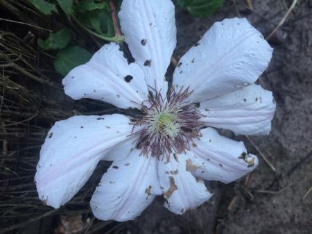Ga eens in het donker met een zaklamp de tuin in (bij voorkeur als het vochtig weer is) en kijk of er slakken zitten bij je plant. Dit jaar zien veel planten er zo uit. De clematis
