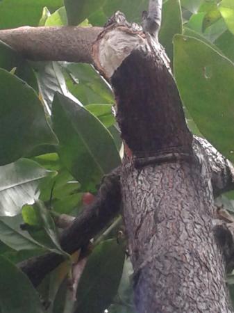 Ik heb net een laurierstruik gesnoeid (4 meter hoog) maar doordat de tak zwaar was is de tak van de hoofdtak afgescheurd. Er is nu een lelijke wond ontstaan, waarbij een stuk van de bast is afgescheurd. Is dit ernstig of wat kan ik hieraan doen?