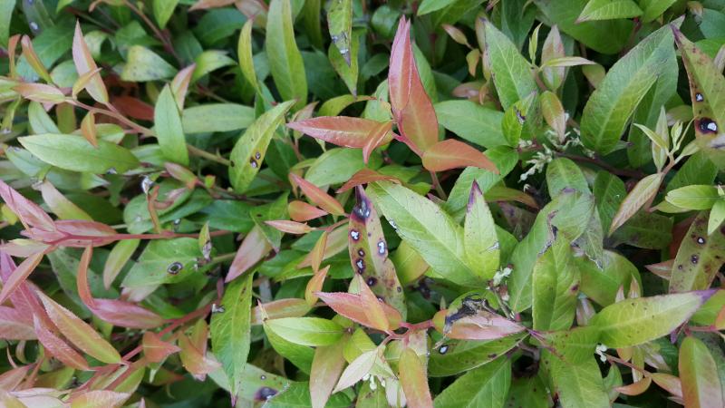 Op de tweede foto zie je wat kleine bladvlekken. Bladvlekken ontstaan als het blad van een plant lang nat blijft. Dit kan gebeuren door overmatig water geven, regenrijke periodes waarin het blad regelmatig lang nat blijft of een luwe standplaats waardoor het blad minder snel opdroogt. Leucothoe is gevoelig voor het krijgen van bladvlekken dus de standplaats dient wel overwogen te worden gekozen. Eventueel kun je de bladeren die het meest zijn aangetast wegknippen.