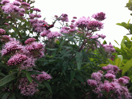 Geen vlinderstruik, maar Eupatoriuminfo-icon maculatum 'Atropurpureum', leverkruid of koninginnekruid. Geen struik, maar een vaste plant.