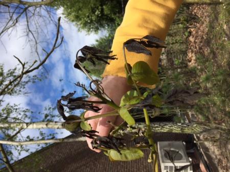 Hier hebben veel struiken bv hortensia's dit soort vorstschade De jonge bladeren bevriezen, vervolgens schijnt de felle zon er op, het iijslaagje of het water fungeert als brandglas en dan krijg je verbranding van het jonge blad.Herstelt zich vanzelf