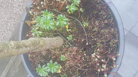 Vorig jaar twee grote bakken met een perenboom gekocht en 1 met een oude druif voor op ons terras. In de pot hebben we ook sedums geplant. Die groeiden er vrolijk op los en in no-time was de hele pot bedekt. In de winter ging de sedum