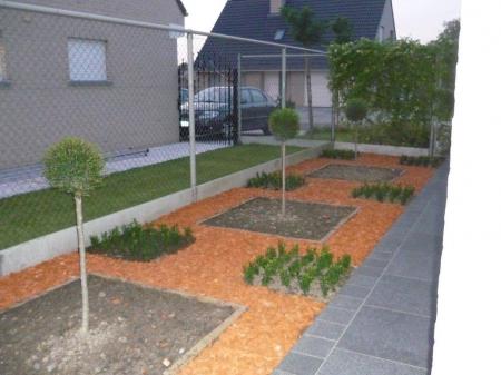 Gezien het feit dat de tuin een strakke uitstraling heeft zou ik in elk vierkant dezelfde bodembedekker planten.