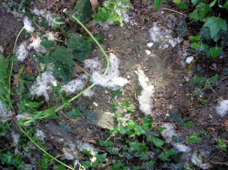 op het moment ligt onze tuin bezaaid met iets wat lijkt op dotjes watten.iemand een idee wat dit zou kunnen zijn?