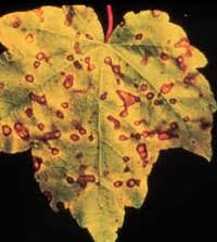 Ziekte begint met per bladdeel 1 a 3 kleine (2mm) zwarte vlekjes. Na enkele dagen verkleurt het
