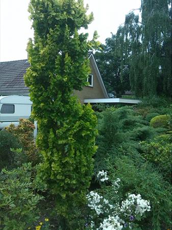 Van vakantie terug en in de tuin aan het werk, zag ik in/op de bladeren van mijn goudiep bessen of bolletjes, die gedeeltelijk vergroeid zijn met het blad.Zie foto's Wat is dit? Een soort galwesp of iets dergelijks en is dit nadelig voor de boom? 1ste foto goudiep in vol ornaat. 2e foto de aantasting