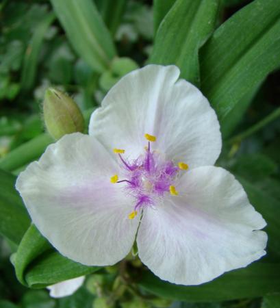 Maar nu vind ik bij: Tradescantia virginiana: eendagsbloem (wat een boeiende naam) en bij afbeeldingen voornamelijk paarse exemplaren.. uiteindelijk ook witte, maar die hebben een wit hartje.. Is het zo'n veelzijdige bloem?