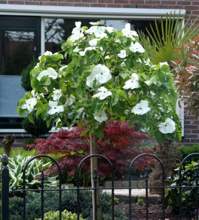 Cornus kousa? Deze heeft 4 tegenoverstaande (witte of rose-rood gekleurde) bracteeën (schutbladeren) met daarin de onopvallende eigenlijke bloeiwijze. Ik kan dat op de foto niet goed onderscheiden.