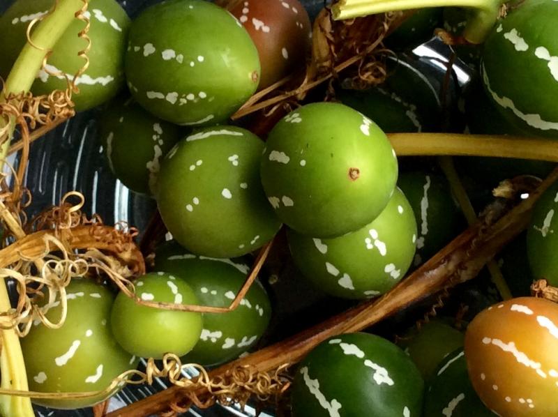 Voor het eerst zag ik gisteren deze leuke groene bolletjes met witte streepjes. Het zou familie van de komkommer zijn. Is er iemand die weet van welke plant ze afkomstig zijn? Ik ben benieuwd!