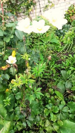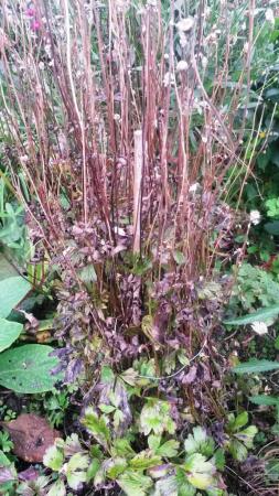 Ha, maar ook niet denk ik. Deze plant is ca 60cm met bloemen tot 80cm. Die bosanemoon is een laag plantje dat verdwijnt gedurende de nazomer. Hierbij een foto van eenzelfde plant nu (ik heb 2 ex. in de tuin staan; de witte bloemetjes erachter zijn trouwens van een Gaura) Excuus voor de mindere kwaliteit foto. Het fototoestel waar ik eerder foto's mee nam heeft de geest gegeven en nu moet ik het doen met het mobieltje. Bellen gaat goed, maar foto's houden niet over ;=)