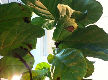 Mogelijk gaat de verwarming laag in het weekend en dat vindt deze plant niet fijn. Gevolg: bruin tot zwart gekleurde bladeren die tenslotte afvallen.