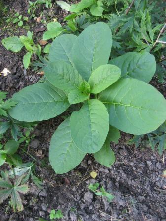 Lijkt mij een jonge Karmozijnbes, Phytolacca acinosa. Zal dan volgend jaar bloeien en bessen geven. Foto's van de plant met bloemen en bessen zul je op dit forum veel aantreffen.