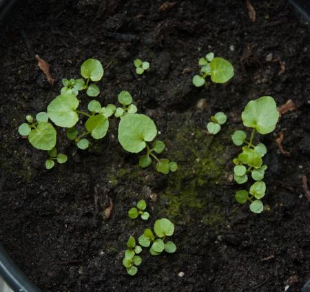 Je hebt gelijk Batdah, nr2 is stinkende gouwe. Die groeit hier op enkele plaatsen in nabije tuinen en op de stoep. Dat verklaart ook het snelle opkomen. Verbaas me enorm over de hoeveelheid ongewensten die er in een zaaibak kunnen landen in zo'n korte tijd.
