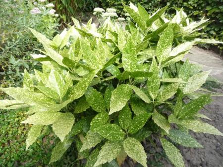 Aucubainfo-icon japonica 'Variegata' bloeit met kleine groene bloemen, tussen de bladeren. De bessen kleuren pas in het voorjaar rood. Mogelijk is de plant nog iets te jong om te bloeien.