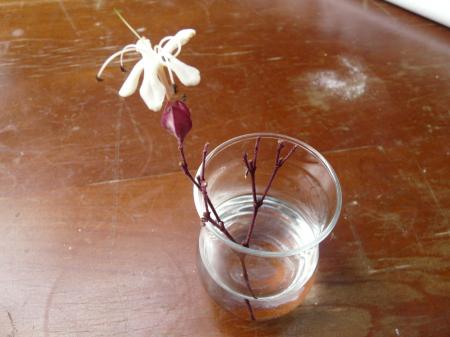 De takjes zijn roodkleurig en de bloem groeit uit een rood vijf- of zeskantig doosje - zie foto. Het bloemetje liet zich gemakkelijk uit het doosje trekken, terwijl het doosje stevig aan het takje vast zat. Ik kreeg als tip te kijken naar de Melia azedarach, waarvan de bloemen wel lijken, maar niet uit zo'n doosje groeien. Bovendien is dat een voorjaarsbloeier.