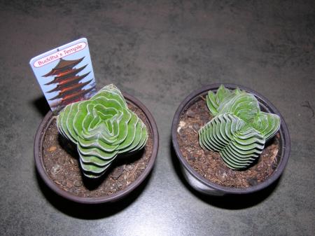 Crassula staat op een van de potjes. Weet iemand 't geslacht en de soortnaam van dit merkwaardige 'flatplantje'?