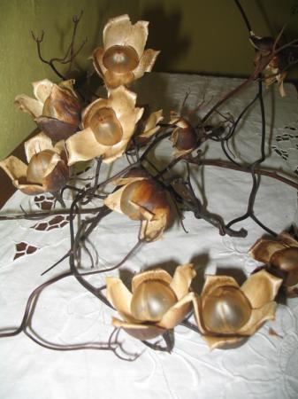 Hier nog even een opname van iets dichterbij op een tafelkleedje. De zaadbol is ongeveer 2 á 2,5 cm hoog en de gehele 'bloem 'is ongeveer 5 tot 6 á 7 cm breed.