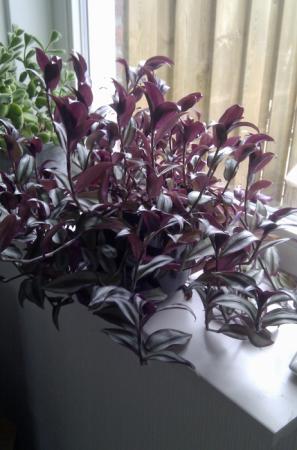 De plant heeft aparte puntige paarse bladeren, met één zilvergrijze kant en een donkerpaarse streep. Paarse stengels die zowel hangen als omhoog groeien. Merci!