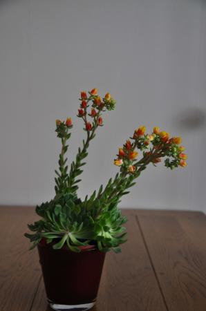 Nr. 1, een kamerplant. Vetplant met oranje/gele bloemen.