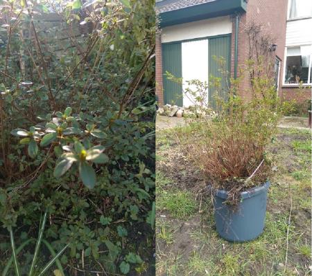 Op de linkerfoto een Rhododendroninfo-icon Catawbiense groep; de rechterfoto lijkt me een Rhododendron japonicum cultivar, tuinazalea. Een combifoto geeft vaak verminderde kwaliteit, dus helaas moeilijk zichtbaar. Rhododendron bloeit slechts in het voorjaar, dus mogelijk komt er nog bloei dit jaar. De plaats lijkt me geen probleem, maar de grondsoort is voor rhodo's wel belangrijk.