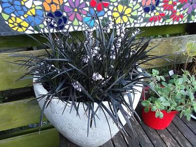 1. Red Baron / Japans bloedgras 2. Ophiopogoninfo-icon p. niger /zwart gras met bloemetjes daarna zwarte bessen.