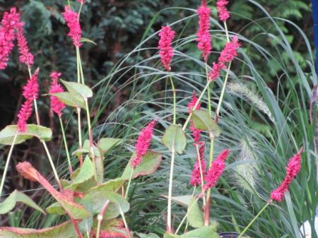 Persicariainfo-icon amplexicaulis cultivar (rode bloemen) en Pennisetuminfo-icon alopecuroides, mogelijk de cultivar 'Hameln'.