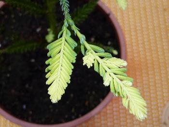 Ik denk eerder aan Sequoia sempervirens 'Adpressa' een dwergvorm van de mammoetboom met cremewitte uitlopers.