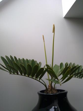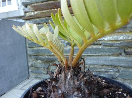 Lijkt mij toch meer een Zamia furfuracea die inderdaad te weinig licht krijgt en twee nieuwe bladeren vormt.