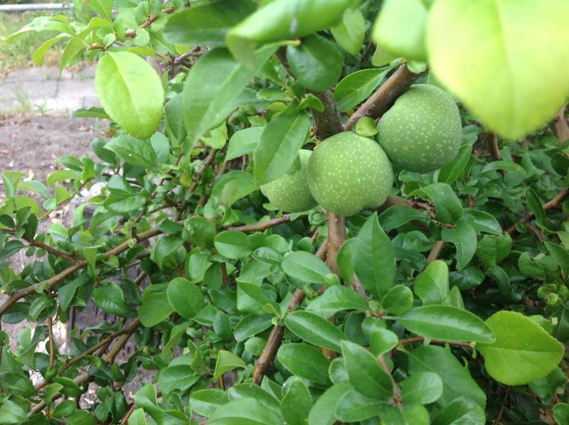 Het is een lage struik met doorns. In het voorjaar bloeide hij wit. Nu zitten er een soort van appeltjes in. Niet heel veel....ook niet aan een steeltje maar zo aan de tak. Groen met lichtgroene stipjes. Als ik me niet verrgis heb ik ze in het vorig najaar oranje gezien( onder de struik op de grond)