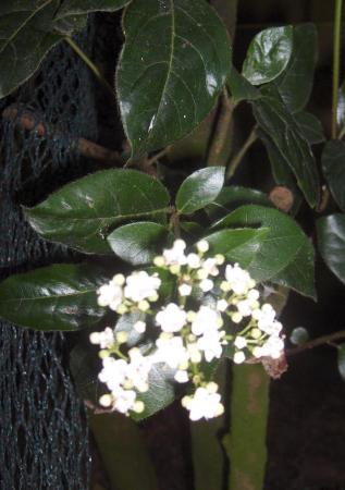 deze groenblijvende boom/ heester staat in mijn tuin .heeft witte bloemen en bloeit nu in januari.
