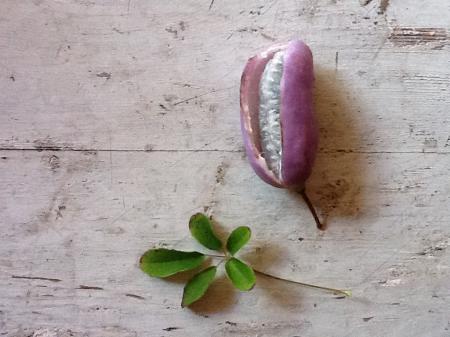 Weet er iemand welke plant dit is? De paarse vruchten zijn zo'n 5 tot 6 cm lang, en barsten open terwijl ze nog aan de struik/boom hangen. Vanbinnen zit er iets dat op een witte rups lijkt, en dat de zaden bevat.