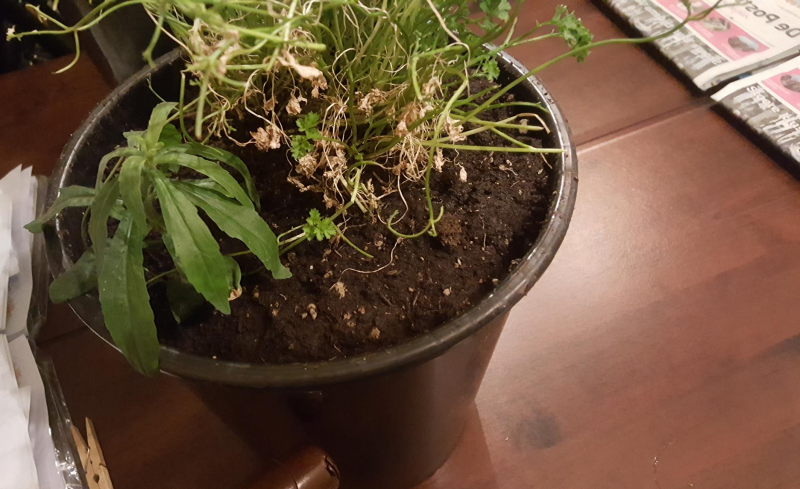 Samgengevat: Over een paar dagen komt de Woningcoperatie de balkon onderhouden, dus had ik mijn balkon even snel schoongemaakt. Sinds de plant in een kappote emmer groeide, wilde ik hem even tijdens de werkzaamheden binnen plaatsten, totdat de werkzaamheden aan het balkon voorbij waren.