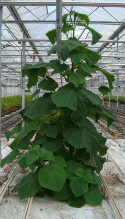 is. Die stengel met die vlekjes heeft een catalpa ook en het blad, hoewel wat aan de kleine kant lijkt ook erg veel op een catalpa. Maar waarom die in een kas staat?