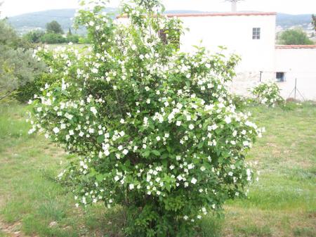 coronarius, boerenjasmijn. Je kunt de struik het beste dunnen, dwz. enkele van de oudste takken geheel vlak boven de grond wegnemen.