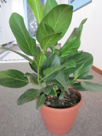 , bladeren: tot 15 cm groot, eivormig, geen scherpe punt, staande op een 4 cm lang steeltje. Bladranden: glad, kleur: middelgroen met opvallend lichte nerven. Blad voelt enigszins fluwelig aan, vooral aan achterzijde. Blad is veel zachter en dunner dan F. Elastica en deze plant is veelstammig (of veel stekken in een pot).